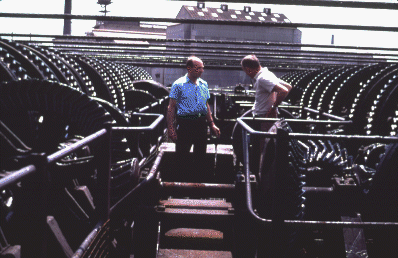 | On the very top of the lift, the operator explains how it works to Pete. (Operator in blue shirt). Immediately behind his knees is the box with the small electric motor that ran the whole lift. |