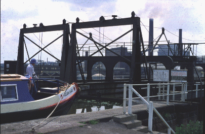 | "Golden Eagle" hired by the Payzants from E.C.C. waits at the canal entrance of the Anderton Lift to enter the lift. |