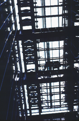 | This is a view from inside the lift (in "Golden Eagle") with camera pointed straight up. Overhead are the pulleys, and the rectangular shape is the motor box. The light is shining on the cables at left hand side of the photo. |